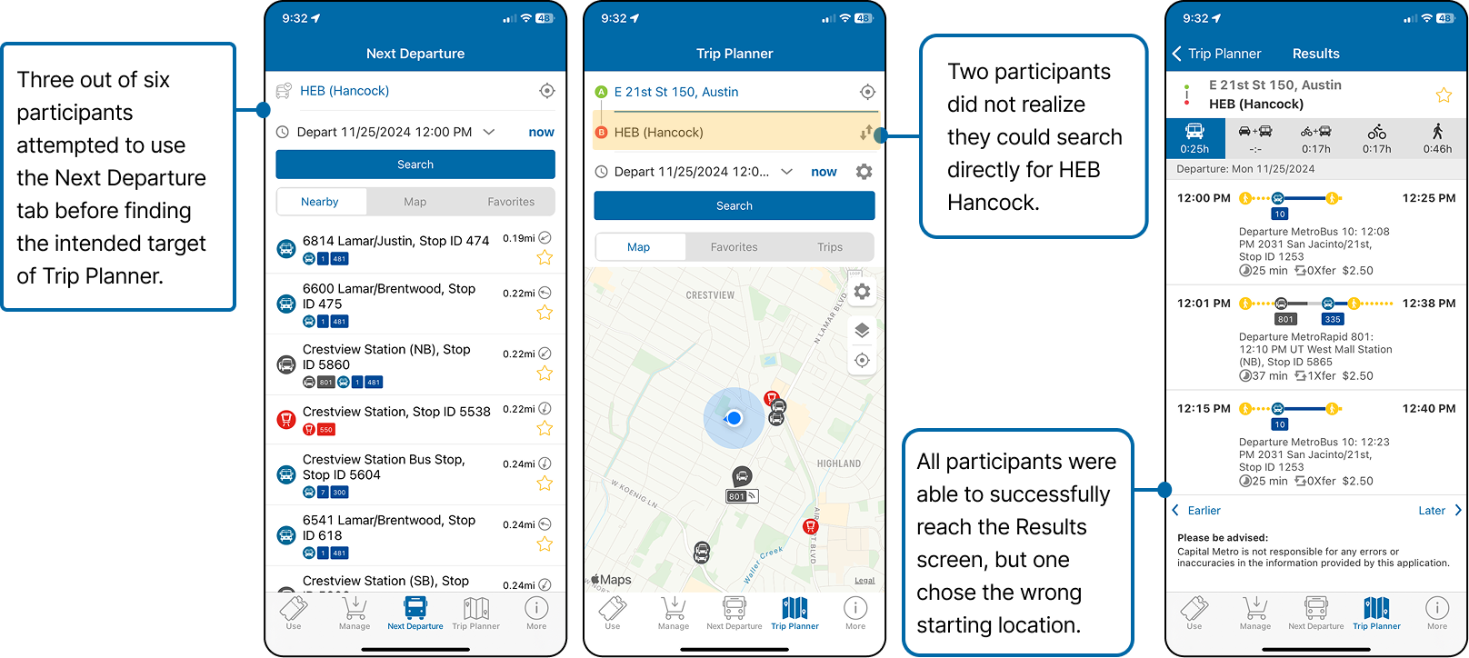 We began our user testing process with a screener to find participants with a mix of experiences with both the CapMetro transit system in general and the CapMetro mobile app specifically.